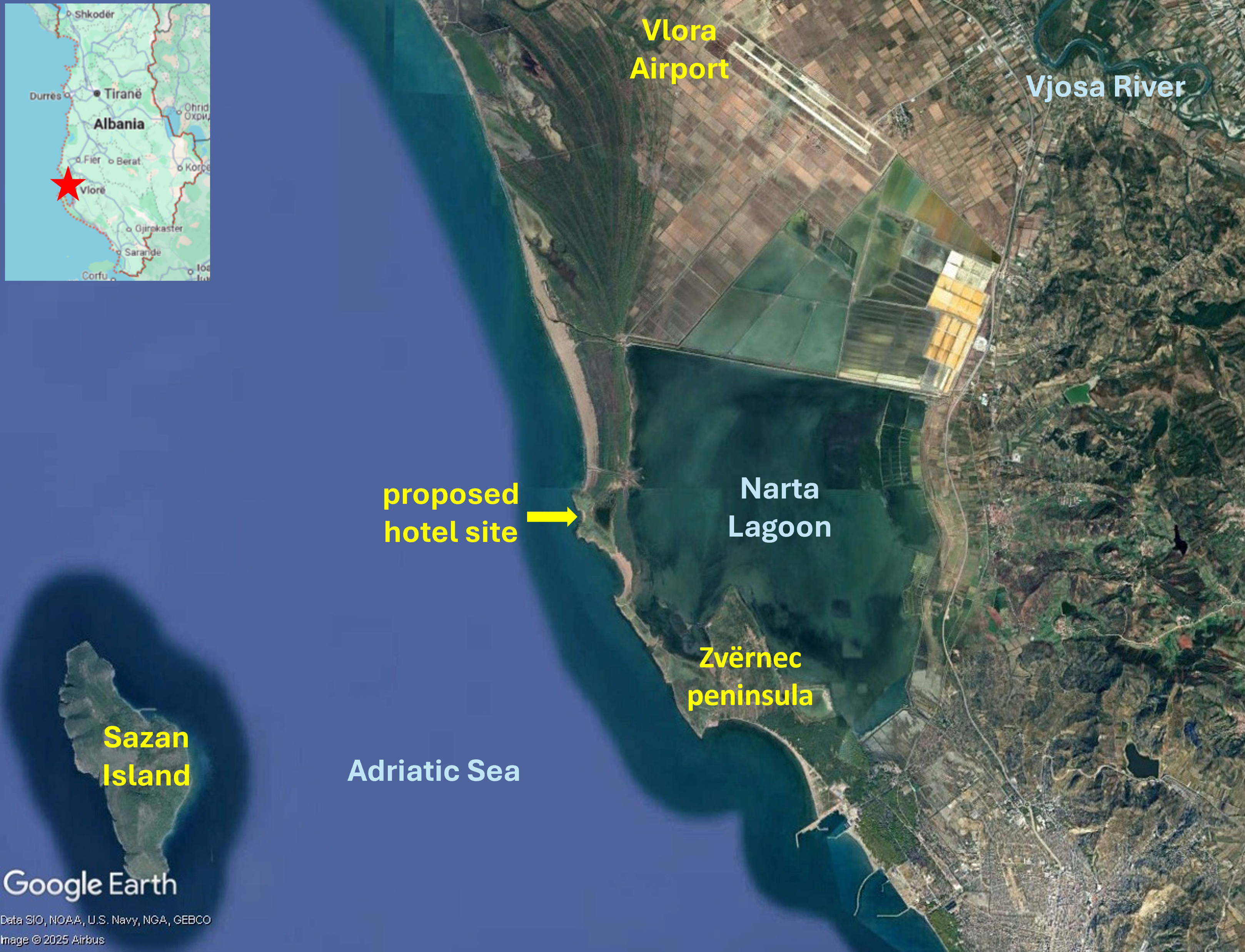 The sites of both proposed tourism projects – the Zvërnec peninsula and Sazan Island – are within protected areas. The Zvërnec peninsula is part of the Pishë Poro-Nartë protected area and Sazan Island is in Karaburun-Sazan national marine park. The Zvërnec peninsula, to the south of Vlora Airport, is a promontory with pine forest and attractive beaches, connected by a wooden bridge to the remains of St. Mary’s, a 13th century Byzantine monastery on a small island in Narta Lagoon. Zvërnec would look very different if the tourism development goes ahead; a 445-hectare luxury resort is envisaged hosting about 6,000 hotel rooms and villas. Architectural renderings of the project published by Kushner’s Miami-based investment company, Affinity Partners, show rows of modern, multi-storey buildings alongside Narta Lagoon and on the dunes, headlands and beaches, a commercial centre, swimming pools, marinas, yachts and a cruise ship.